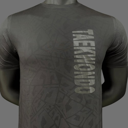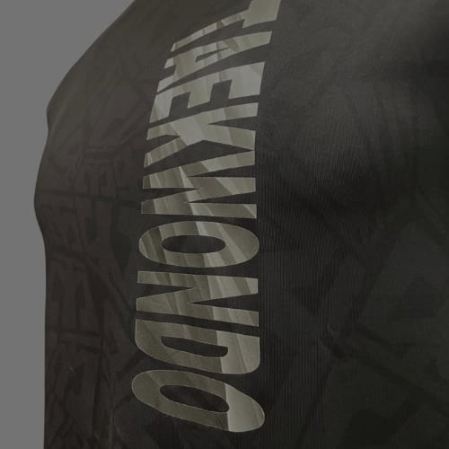 Camiseta negra con TAEKWONDO en pecho, tejido técnico.