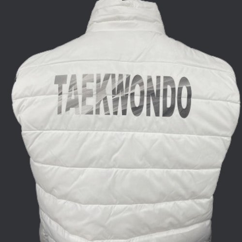 Chaleco BLANCO deportivo con logo WTF y posibilidad de personalizar la espalda con la palabra TAEKWONDO.