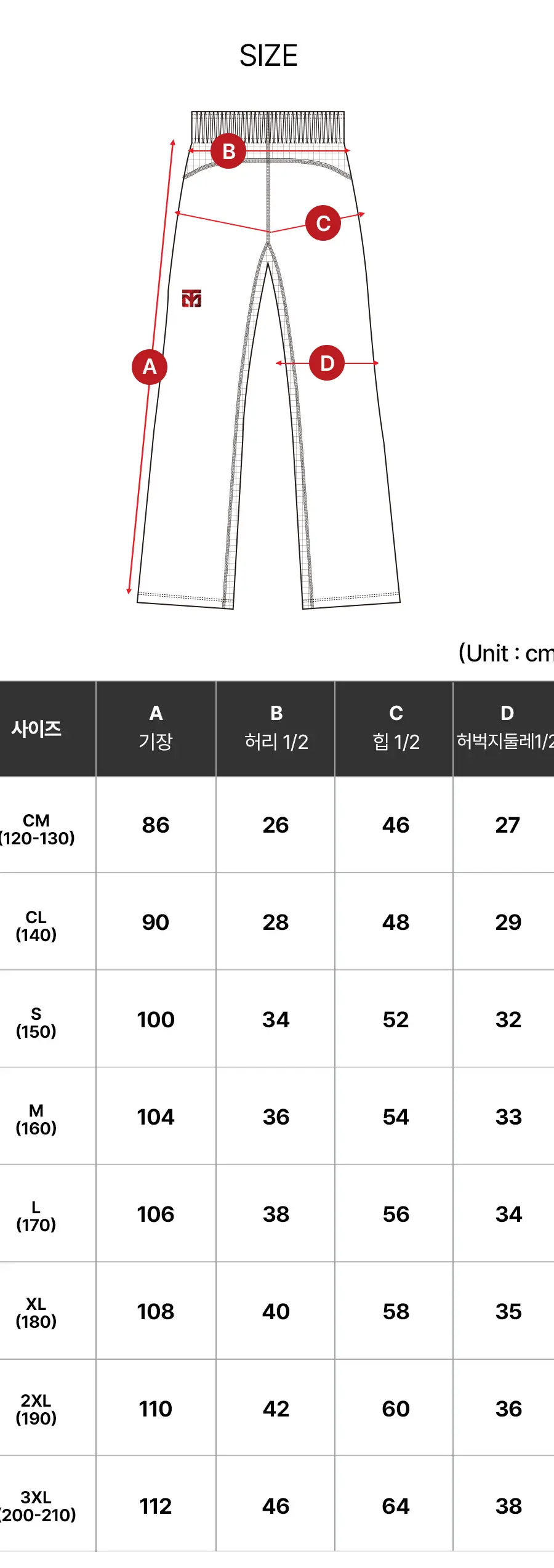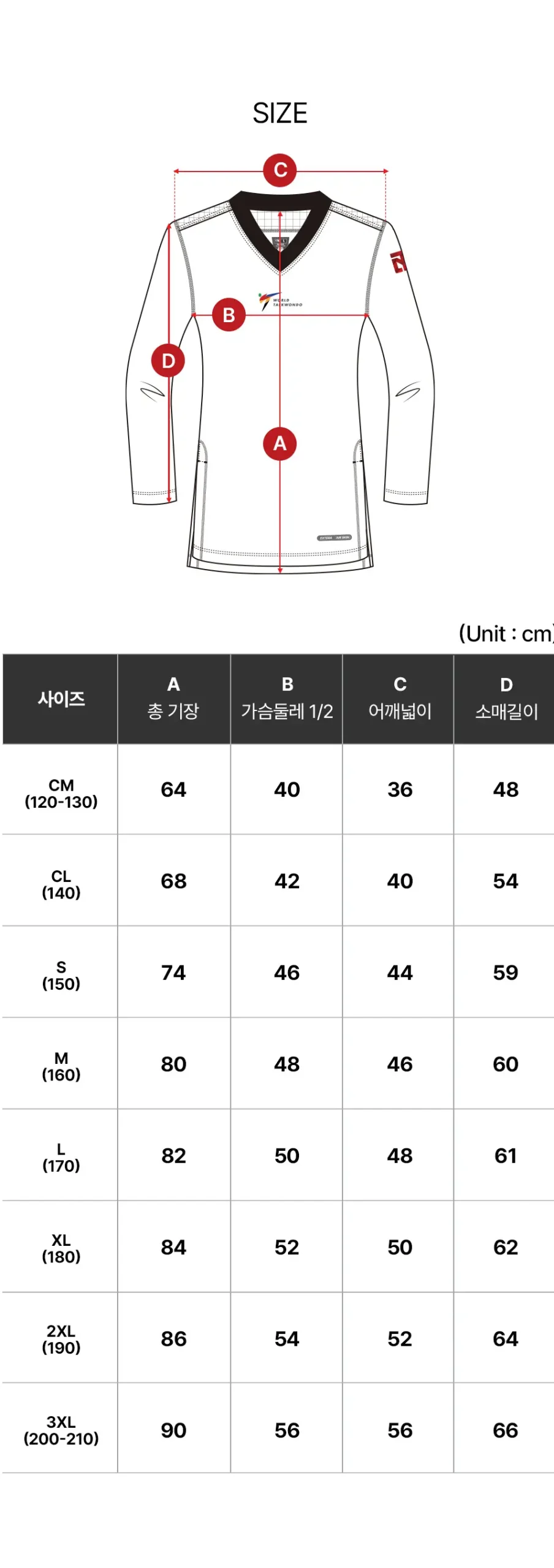 150 S, 160 M, 170 L, 180 XL, 190 XXL, 200 3XL